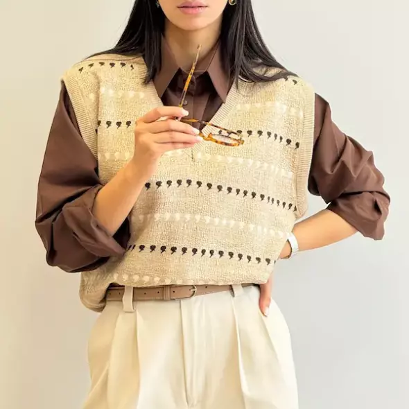 این ژیله بافت زنانه در چهار رنگ جذاب نسکافهای، سرمهای، مشکی و استخوانی عرضه شده است؛ رنگهایی که بهراحتی با بیشتر آیتمهای کمدت ست میشوند. طراحی آن آزاد و مدرن است و برش آن به گونهای انجام شده که روی مانتو، پیراهن یا بلوز بهخوبی مینشیند. ظاهر ساده و در عین حال شیک ژیله باعث میشود هم برای استفاده روزمره مناسب باشد و هم برای موقعیتهای نیمهرسمی. در استایل مینیمال یا کژوال، این ژیله جلوهای خاص به تیپت میبخشد.