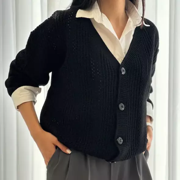 اگر به دنبال پوششی سبک، لطیف و در عین حال شیک هستید که به راحتی با استایلهای مختلف ست شود، کاردیگان آفوایت مشکی آی بولک دقیقاً همان چیزی است که میخواهید. این کاردیگان با طراحی جذاب، رنگ خنثی و بافتی نرم و خوشدوخت، یکی از آن لباسهایی است که به محض پوشیدن، حس راحتی و اعتمادبهنفس را به شما هدیه میدهد.
