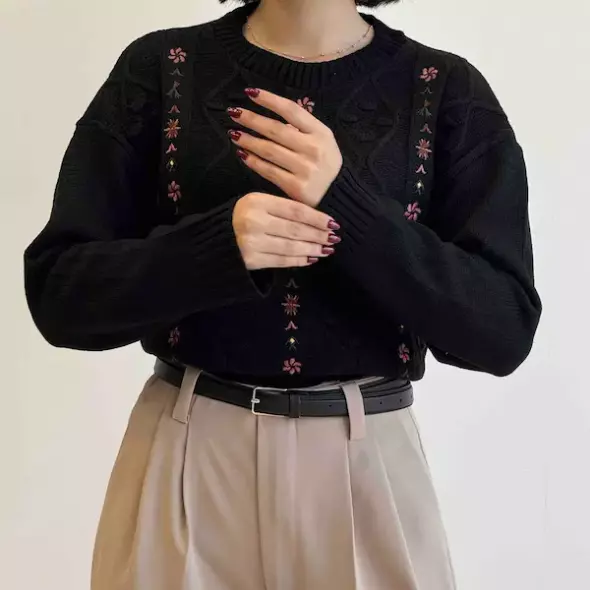 این بافت با طرح گل‌های ظریف و ترکیب رنگ مشکی استخوانی، جلوه‌ای مینیمال اما بسیار شیک دارد. رنگ‌های ملایم و هماهنگ آن باعث می‌شود به‌راحتی با انواع شلوار جین، دامن یا حتی شلوار پارچه‌ای ست شود. طراحی آزاد و راحت بافت باعث شده که هم برای استایل‌های روزمره و هم برای موقعیت‌های نیمه‌رسمی انتخابی عالی باشد. جزئیات ظریف گل‌ها روی بافت، جلوه‌ای خاص ایجاد کرده که در نگاه اول حس کیفیت و دقت در طراحی را منتقل می‌کند.