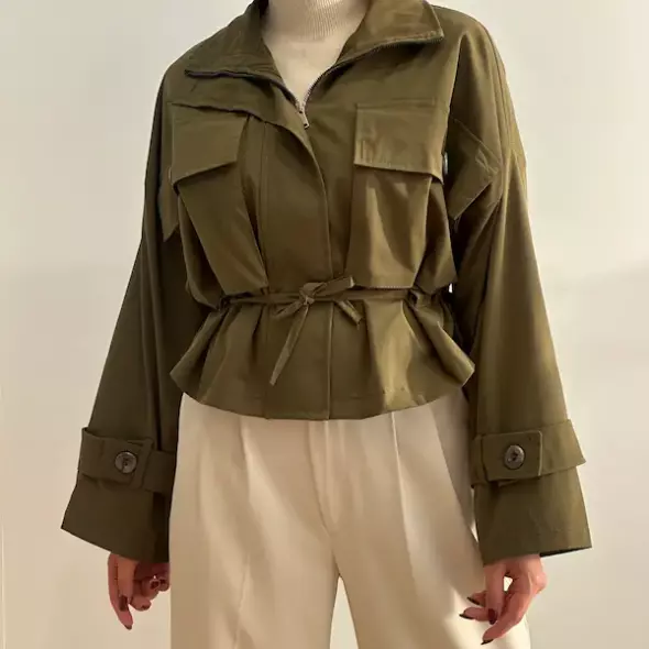 ترنچ کت مدل 1004981 در چند رنگ جذاب و پرطرفدار ارائه شده است: فیلی، مشکی، نباتی، سبز لجنی، یشمی، کرم و نسکافهای. هرکدام از این رنگها، حس خاصی را منتقل میکنند و بهراحتی با دیگر آیتمهای کمدتان ست میشوند. طراحی مینیمال و خوشدوخت آن باعث شده تا فرم بدن را بهزیبایی نشان دهد، بدون آنکه احساس تنگی یا سنگینی ایجاد کند. دکمهها و جزئیات ظریف دوخت، جلوهای کلاسیک به کت دادهاند و درعینحال حالوهوای مدرنش را حفظ کردهاند. وجود گت در قسمت کمر، امکان تنظیم و خوشفرمتر شدن استایل را فراهم کرده است؛ بنابراین هم برای استایل آزاد و هم برای استایل جذب قابل استفاده است.