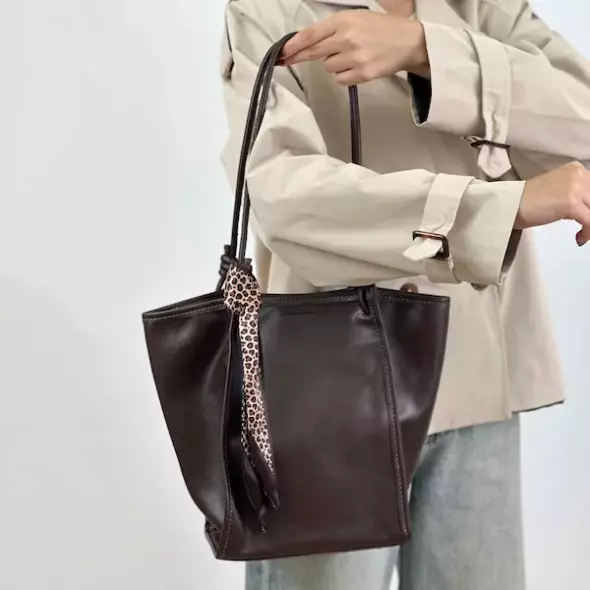 این کیف با فرم سطلی و طراحی مینیمال خود، حس خاص بودن را منتقل میکند. رنگ قهوهای سوخته در کنار مشکی تضادی چشمنواز ایجاد کرده که جلوهای لوکس به کیف میدهد. وجود مینی اسکارف ظریف و کیف کوچیک داخلی، ترکیبی از زیبایی و کاربرد را به ارمغان آورده است.