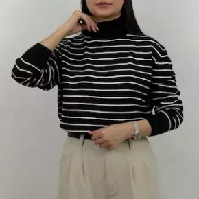 این بافت یقهاسکی با فرم استاندارد و تنخور مرتب طراحی شده تا روی بدن کاملاً شکیل دیده شود. یقه اسکی آن ارتفاع مناسبی دارد و بدون ایجاد حس خفگی، گرمای دلنشینی ایجاد میکند. مدل بافت، بافتی ظریف و یکدست است که ظاهر لباس را بسیار شیک و مینیمال نشان میدهد.